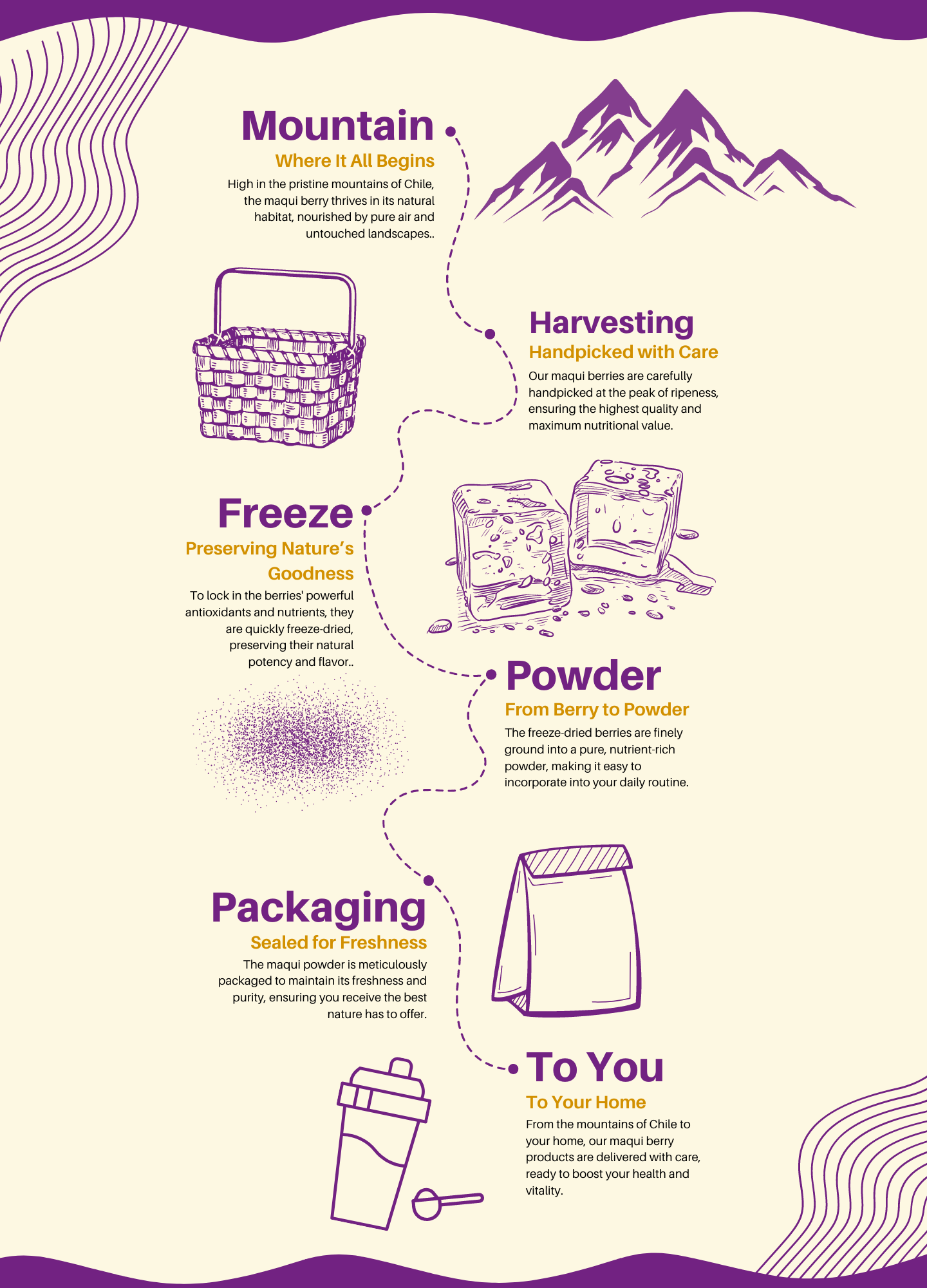 Our vision is to elevate the status of maqui berries, making them as celebrated and integral to wellness as other superfruits like acai and goji berries. We strive to spread awareness of their exceptional antioxidant benefits, bringing this rare and powerful superfruit to the forefront of health and nutrition.
