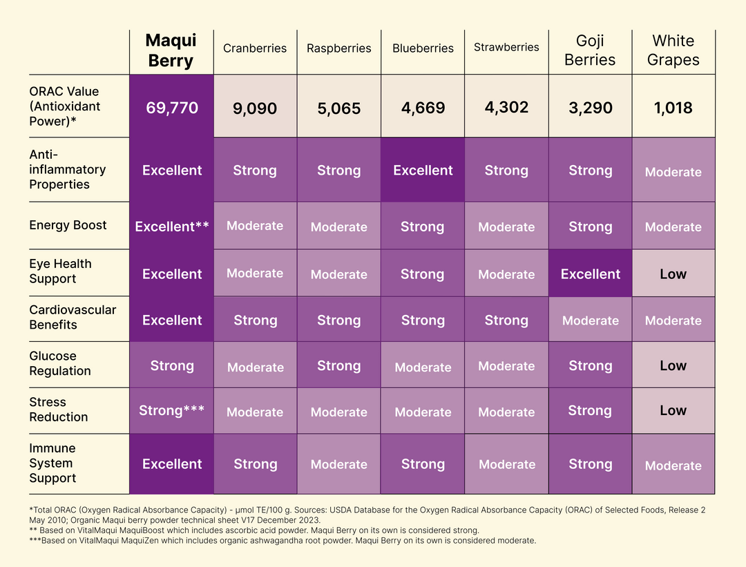 Discover why maqui berry stands out among the most popular superfoods. With an exceptional ORAC value and a range of superior health benefits—from anti-inflammatory properties to cardiovascular support—maqui berry is a powerhouse of nutrition. Compare it to other well-known berries and superfoods, and see how it excels in promoting overall well-being. Whether you're looking to boost your immune system, enhance eye health, or manage stress, maqui berry offers unparalleled advantages that make it a vital addition to your wellness routine.